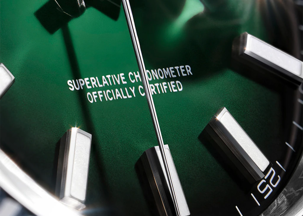 Look closer and the anniversary details appear. The winding crown features the number 100 in relief. On the slate dial, the inscription ‘100 years’ sits at 6 o’clock in place of the usual ‘Swiss Made’ marking. Each five-minute interval on the minute track is marked by a green square, and the name ‘Rolex’ is pad printed in the same green, the brand’s signature colour.