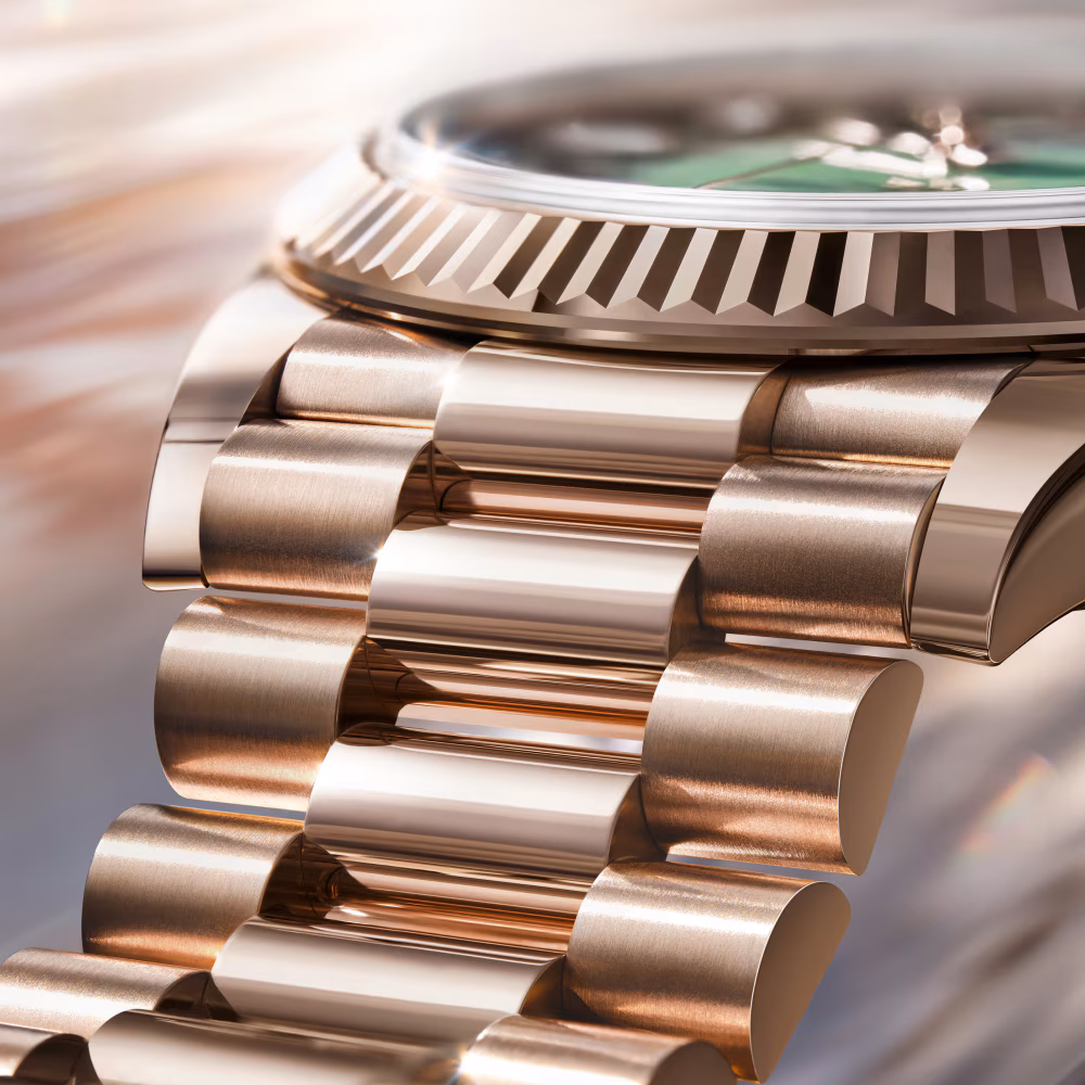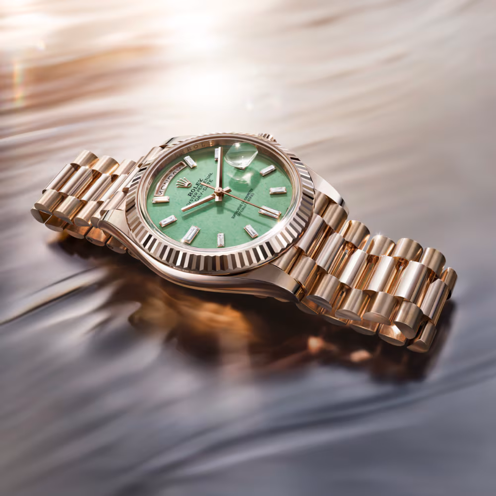 Rolex has introduced a brand new 18 ct gold alloy: Jubilee Gold. The metal, which has tones of soft yellow, warm grey and gentle pink, debuts on an exclusive version of the Day-Date 40. The dial is cut from bright green aventurine, a natural stone from the quartz family, and features ten baguette-cut diamonds around the hour circle. The fluted bezel and President bracelet with concealed Crownclasp complete the look.