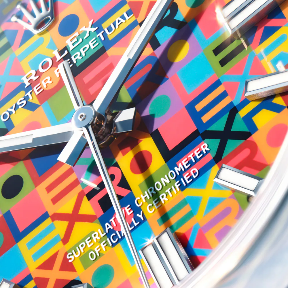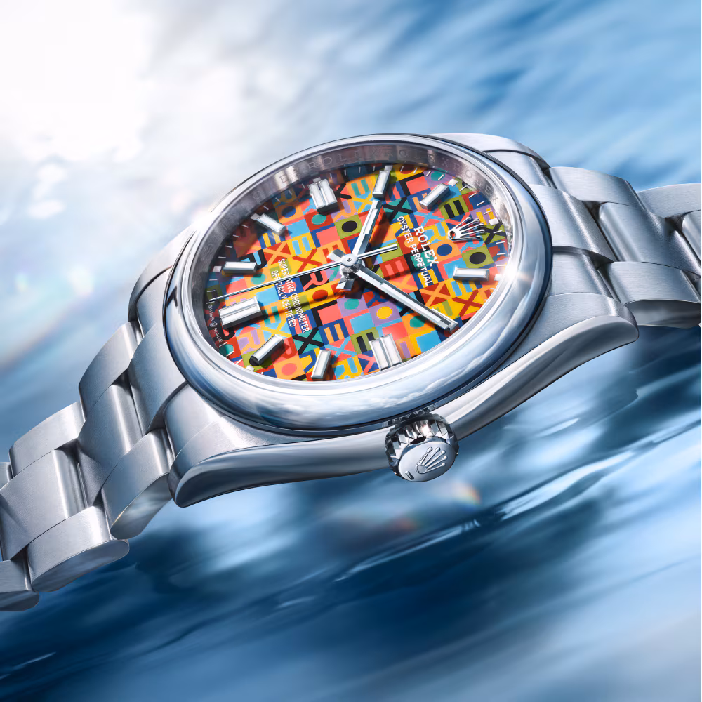 The Oyster Perpetual 36 takes a different route. Here, the dial is the main event. A multicoloured lacquer dial decorated with the Jubilee motif revisits a design first seen at the end of the 1970s. The pattern spells out the Rolex name in ten different colours, applied one after another rather than all at once. It is playful and sophisticated, a celebration of the brand’s dial-making craft rather than its anniversary.